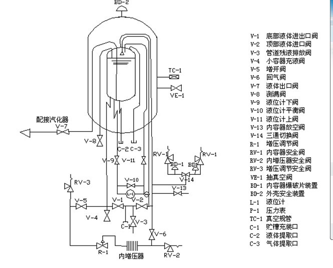 3.2.4檢查貯槽壓力是否正常,當貯槽壓力接近或等于最高工作壓力時,須打開內(nèi)筒放空閥V-13泄壓。